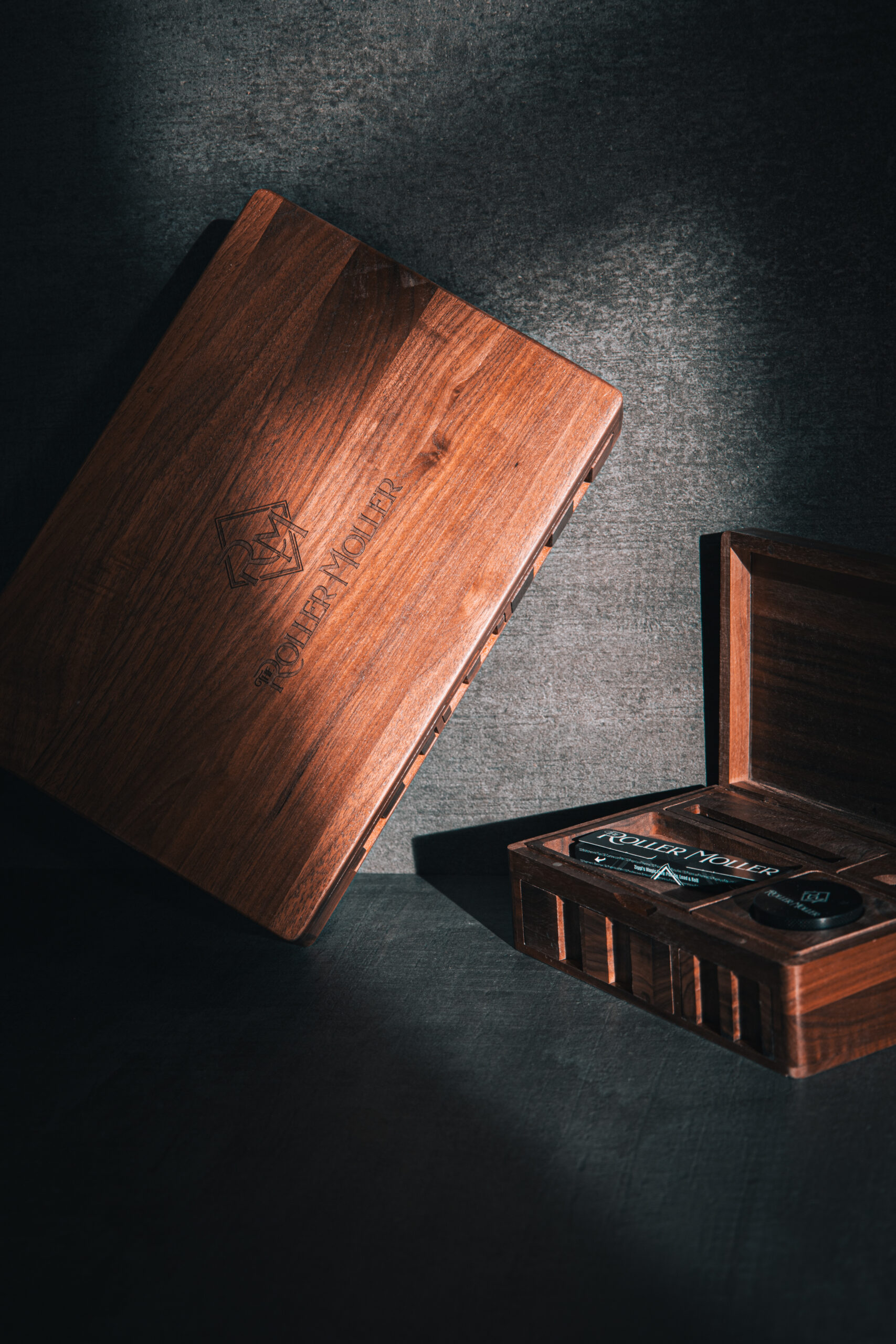 Two handcrafted wooden boxes. One for the bedside table, one for the road. The Grand Edition (32×22×7.5cm) holds a full evening’s supplies. The Compact Edition (22×14.5×7.5cm) slips into any bag. Together, they cover every setting — and make an unforgettable gift.